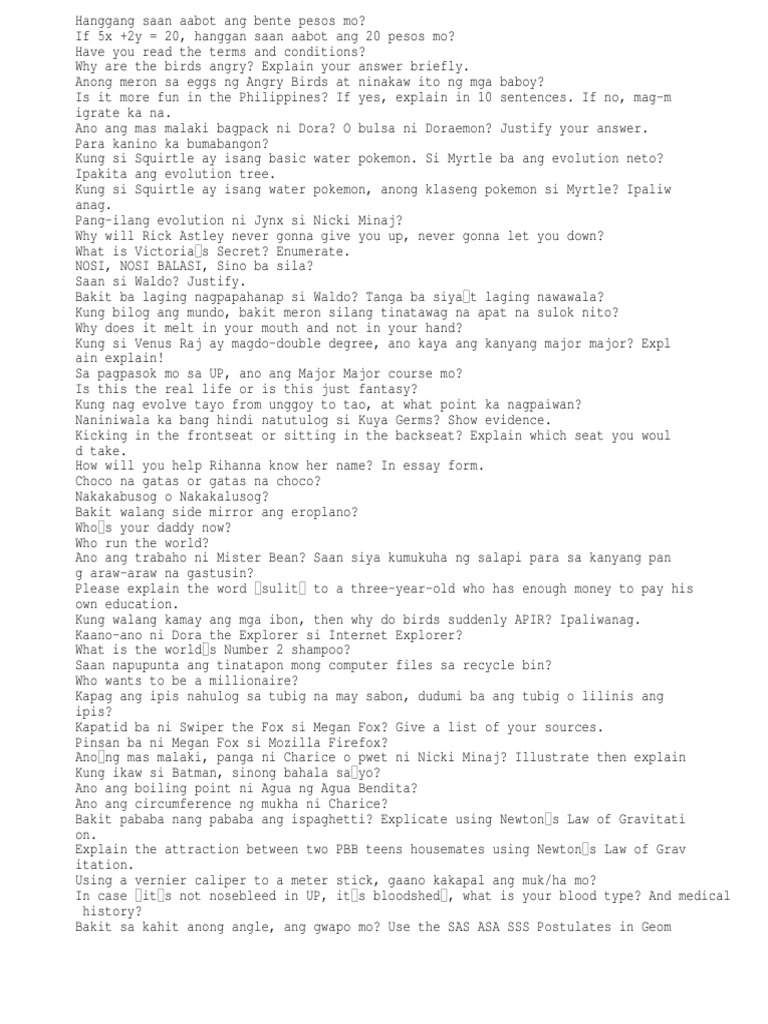 Upcat questions jokes - Dental Vantage - Dinh Vo DDS from 1.bp.blogspot.com How many upcat takers are there per year? How long does it take to take the upcat test? We will be adding test questions to this quiz periodically as well as randomize the items for every quiz so that test takers will see different questions every time. Whether you're looking for a full ucat mock or ucat questions for each section to improve your skills such as spotting extreme language in ucat verbal reasoning questions or getting more confident. What are the subsections of the upcat practice test? Apr 20, 2020 · the upcat has no filipino questions. Reduce the spring constant v b. Then which of the following must be an odd number?